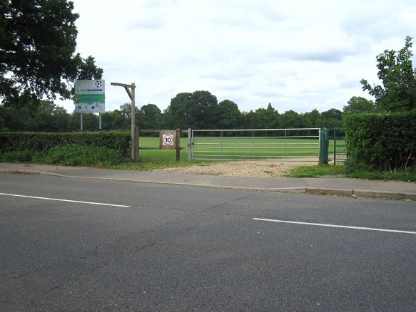 Turn in at the gate in Highfield Lane, pictured below. The post code of the adjacent house is AL4 0RE. The gate will usually be open, but club members can use either their key or ring the field captain if it’s not. Drive to the end of the track, where it bends to the left onto the car park. Be aware there is a large sleeping policeman towards then end of the track.