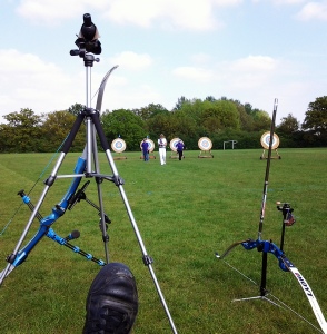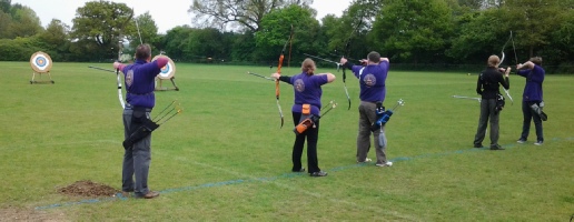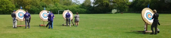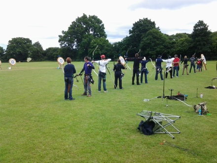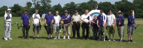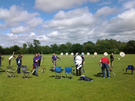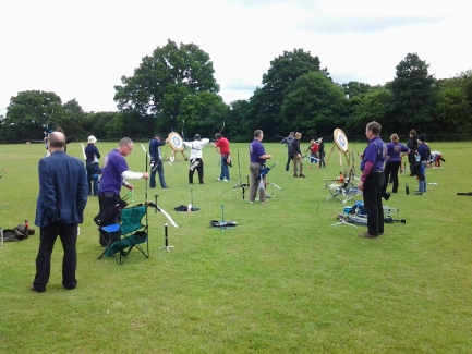 On what was the hottest day so far in 2013, twelve of our best gathered at Highfield Park to shoot the historic United Bowmen round. Following the rules as best we could we flew a Union Jack behind the shooting Line, with a couple on the bosses too for good measure and did our best to hit the targets at 80 yards.